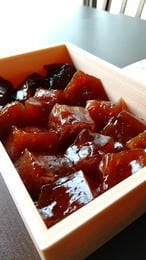 てらまち福田のオリジナル和菓子「竹糖餅(たけとうもち)」は、タピオカを練り上げて作ります。絶妙なもちもちとした触感、和三盆の上品な甘みが口の中で広がり、冷たく冷やしても固くならずにお召し上がりいただけます。